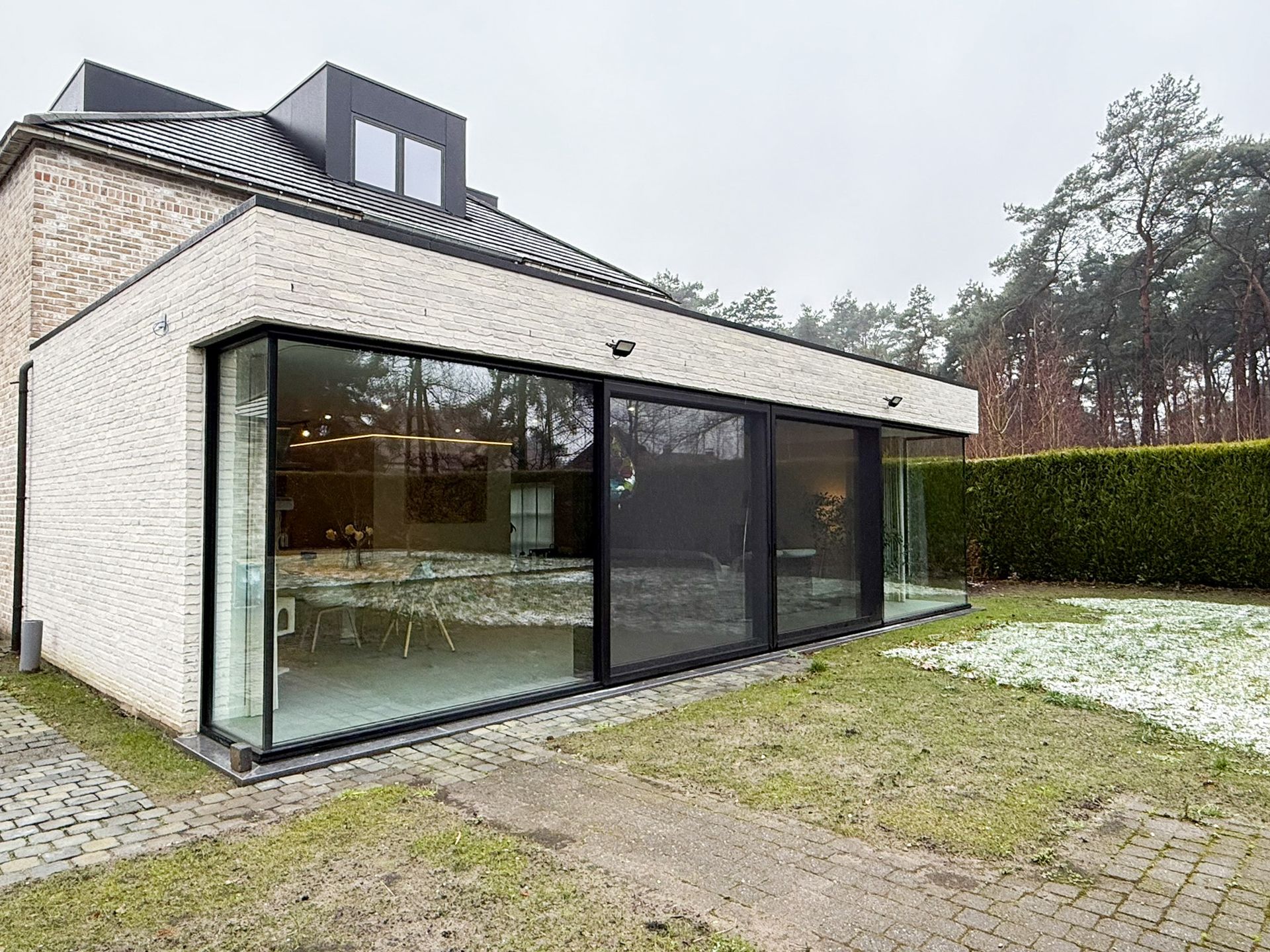 Wij hebben de volledige breekwerken uitgevoerd, achterbouw afgebroken, glazen folie afgebroken en afgevoerd, alles uitgegraven voor een nieuwe stabiele fundering te creeren voor de vernieuwde grotere aanbouw die quasi volledig uit glas bestaat.
